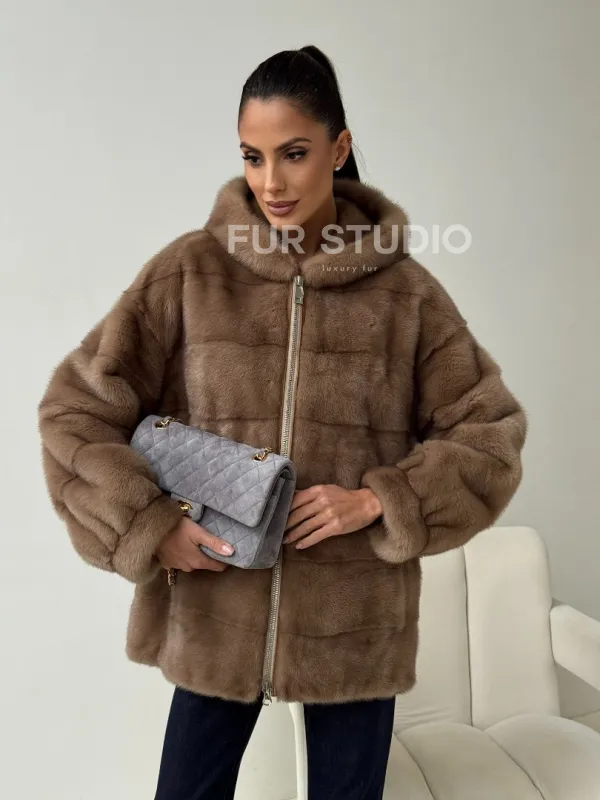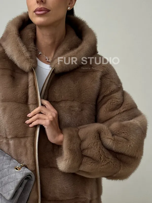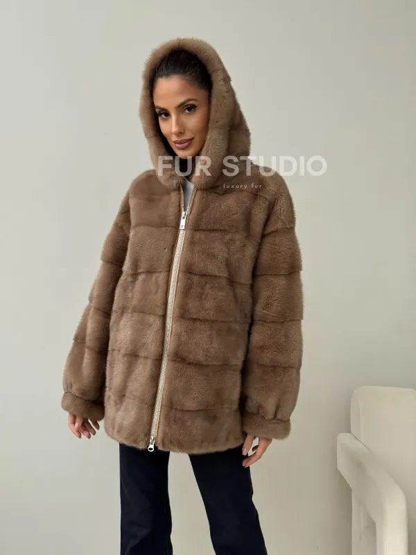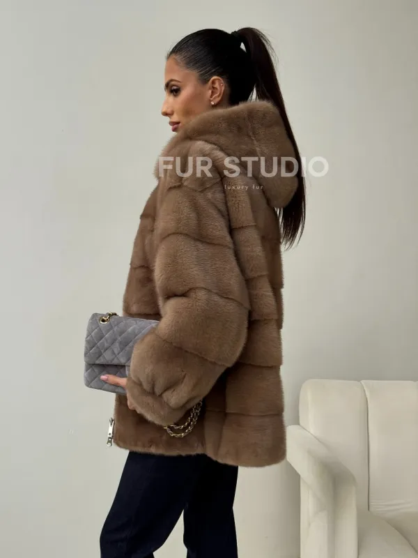 Бежевая норковая куртка с капюшоном 102430