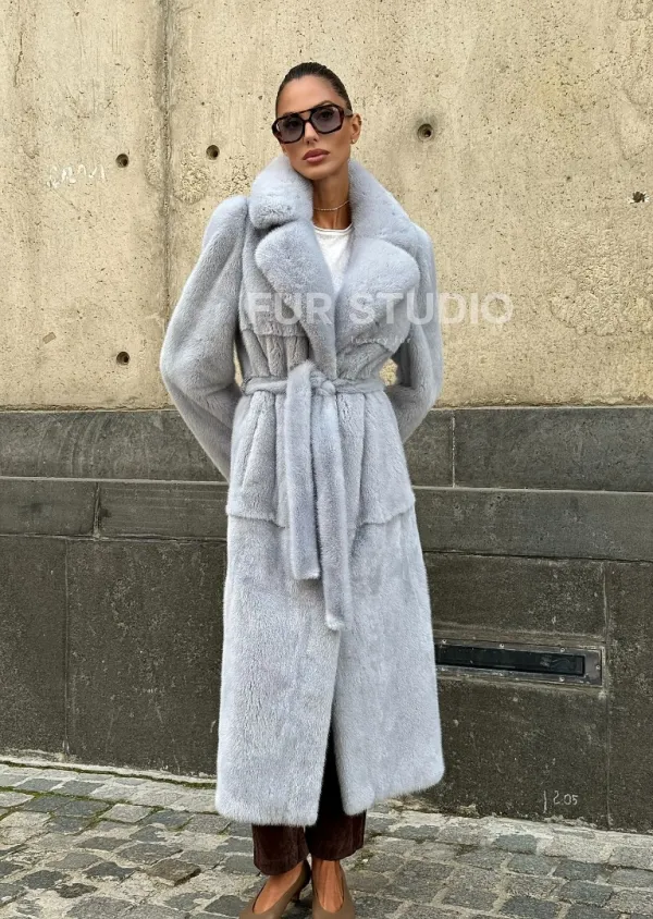 Мех данной шубы аукционная норка, цвет голубой. Предлагается в размерах от 42 до 52. Длина модели 115-120 см, что выгодно подчеркивает фигуру девушек. Эта модель идеально подойдет для девушек и женщин, предпочитающих роскошные натуральные меха.