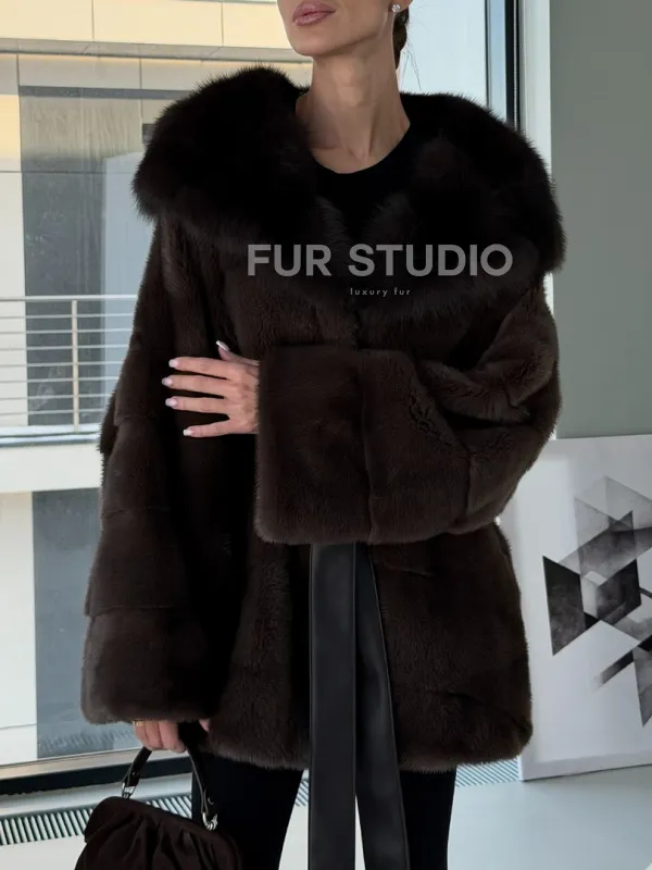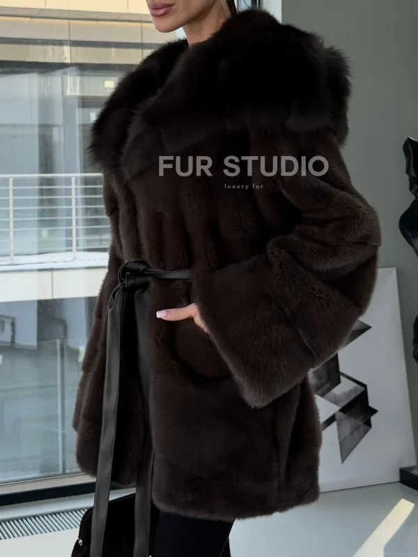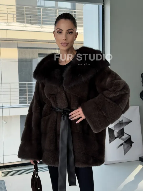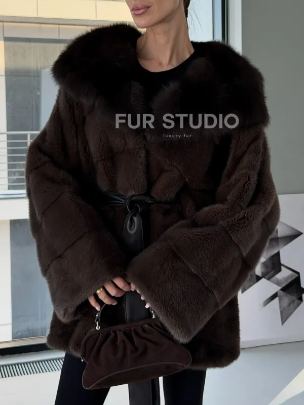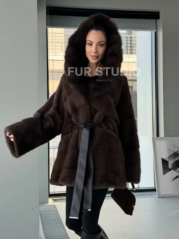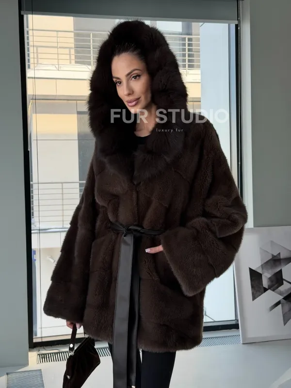 Норковая шуба кимоно с капюшоном куница 102892